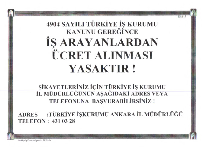4904 Sayılı Kanun Uyarınca İş Arayanlardan Ücret Alınması Yasaktır.
