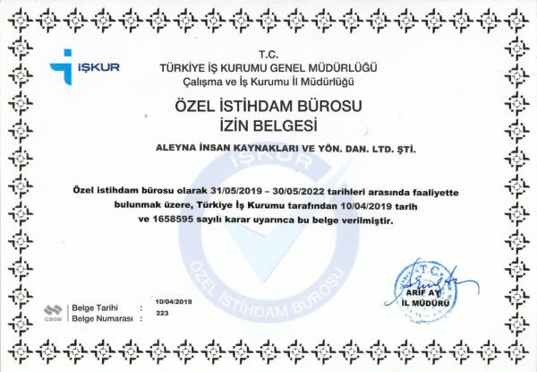 Türkiye İş Kurumunun 31.05.2013 / 30.05.2016 Tarih ve 223 Numaralı İzin Belgesi İle Faaliyet Göstermektedir.
